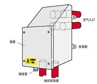 為監(jiān)控加熱器的工作情況,提供了一套溫度自動調(diào)節(jié)裝置,監(jiān)控離開空氣采樣扇的空氣溫度。如果加熱器沒有工作,溫度自動調(diào)節(jié)裝置的觸點閉合并發(fā)出一般故障信號。當GST空氣采樣式感煙火災(zāi)探測報警器與模擬編碼火災(zāi)自動報警系統(tǒng)連接時,可利用消防模塊(監(jiān)視模塊)進行故障報警。