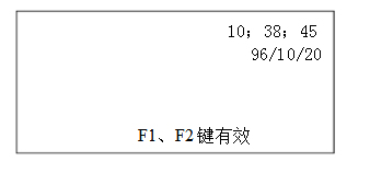 密碼正確后顯示如上面菜單,密碼錯誤則返回封面菜單。 其中小時處(即數(shù)字“10”反顯,用“F1”鍵進(jìn)行切換,依次反顯時、分、秒、年、月、日,用“F2”鍵進(jìn)行反顯處時間修改,每按一次“F2”鍵,反顯處數(shù)字增一。